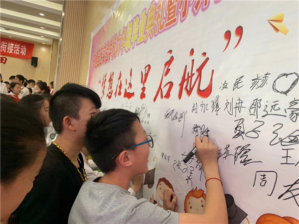 毕业生纷纷在“梦想在这里启航”展板上签名留念。以梦为马,不负韶华,乘风破浪,驶向幸福彼岸。