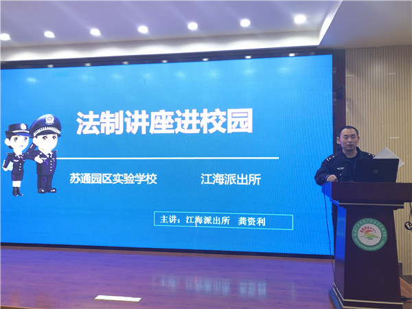 为进一步推进平安校园建设,提高学生的法制观念和安全防范意识,引导学生正确处置校园欺凌事件,有效预防未成年人违法犯罪,营造互助友爱、文明和谐的校园氛围,促进学生安全健康成长, 4月23日中午,南通苏通科技产业园区实验学校特邀龚资利警官莅临学校,为八年级全体学生开展“增强安全意识,学会自我保护”法制教育讲座,讲座由储德杰副校长主持。
