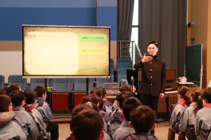南通开发区实验小学教育集团星湖校区朱鑫荣老师介绍了《岁月留声——李叔同的学堂乐歌》的大单元设计思路,教学中通过不同演唱形式的深入,让学生在掌握演唱技巧、演唱形式的同时更好地去感受作品的美感与特点。
