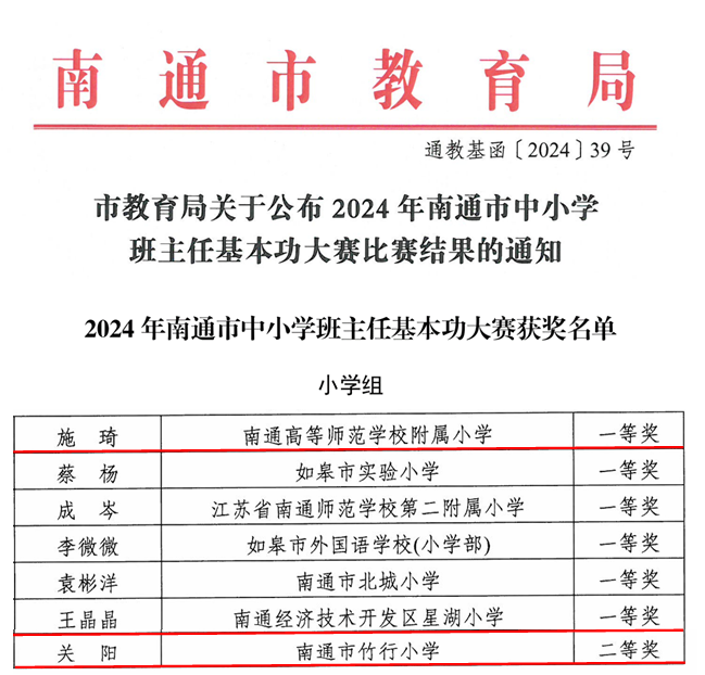 近日,2024年南通市中小学班主任基本功大赛圆满落幕,经过激烈的角逐,我区施琦、王晶晶两位老师荣获一等奖,其中施琦老师获一等奖第一名,关阳老师荣获二等奖。
