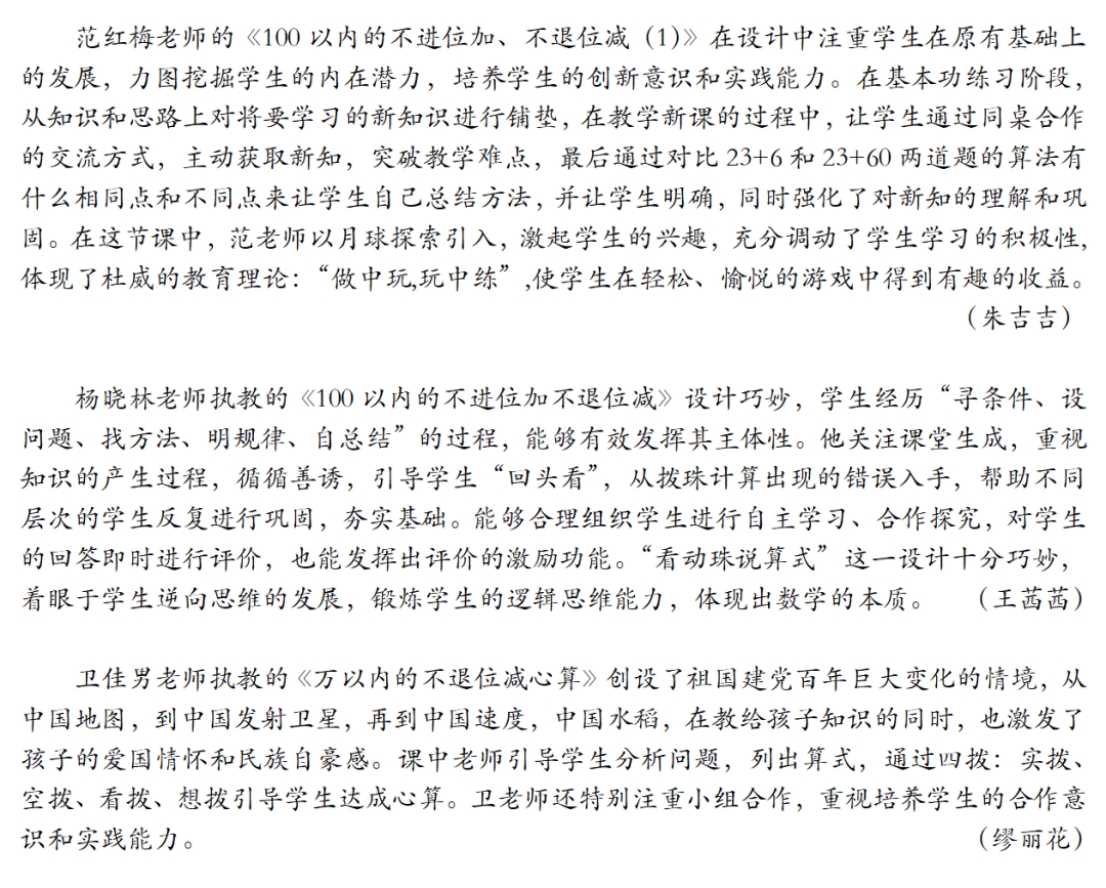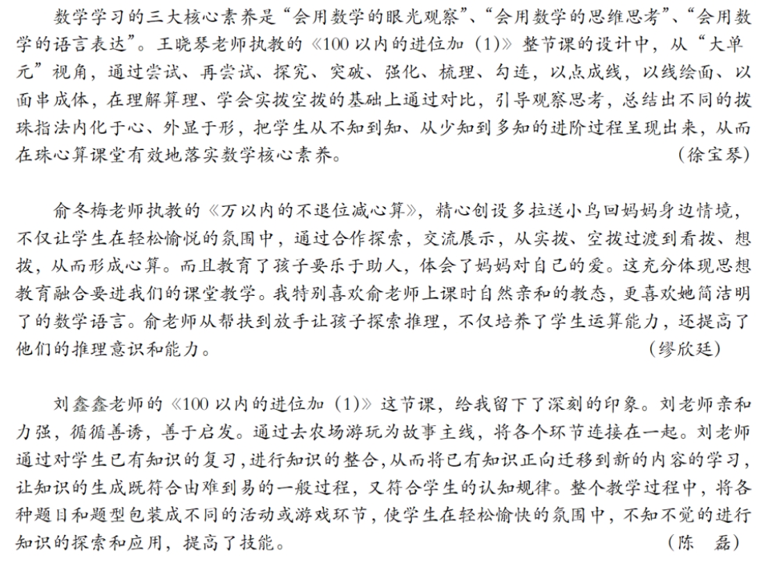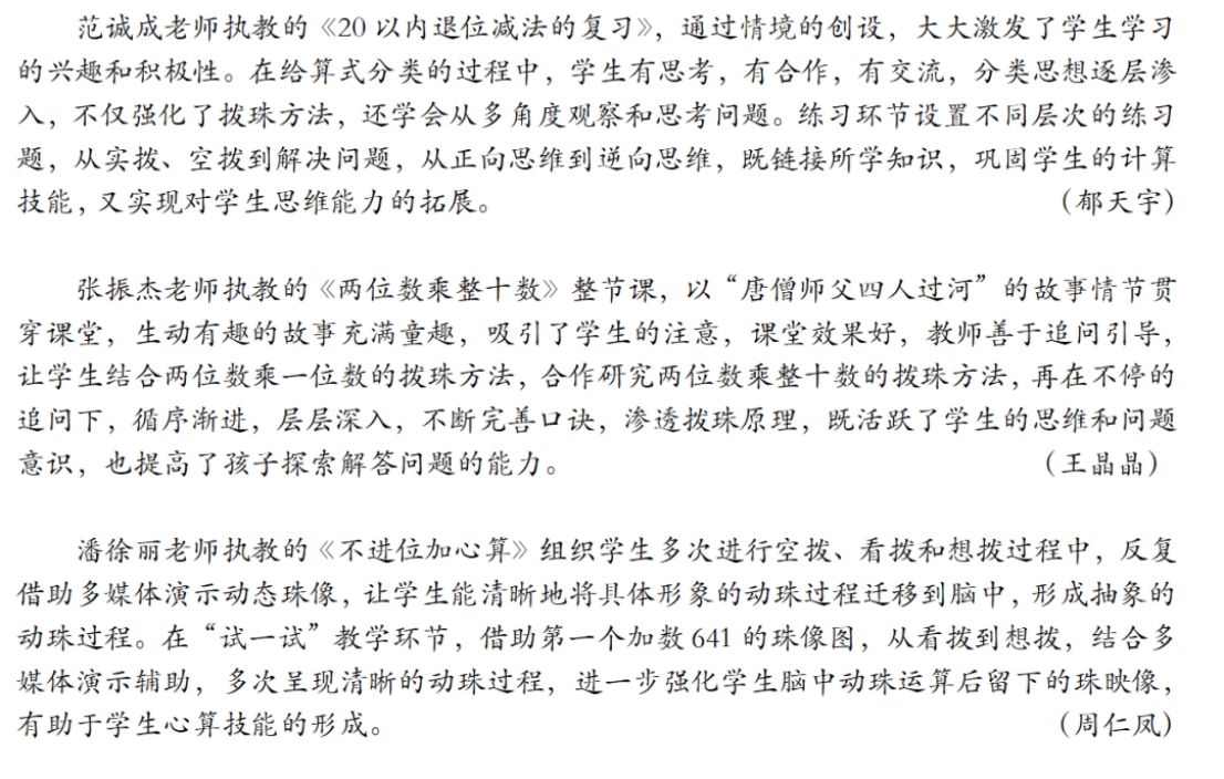 “不进位加心算”是《珠心算》第四册第二单元的内容,是在学生已经学习掌握了三位数加两、三位数不进位加的实拨、空拨基础上安排的学习内容。根据“珠算在前、心算在后”的原则,遵循“实拨是基础、空拨是关键、看拨是过渡、想拨是最终目标”的宗旨,教材安排641+253的例题,让学生先体验不进位加(直加)动珠过程,形成心算;再安排“试一试”641+234的心算,学生进一步体验十位和个位是满五加的不进位加心算。 “两位数乘整十数”是《珠心算》第六册第三单元的内容,是在学生已经学习了两位数乘一位数、三位数乘一位数的基础上安排的内容。从已有经验出发、猜想两位数乘整十数的珠算方法,并结合口算、列竖式计算验证结果总结并应用。在合作探索中推理方法,在愉悦的 课堂上,孩子们整齐划一的拨珠动作,标准规范的拨珠指法,彰显了孩子们长期以来训练有素的成效、扎实的基础;孩子们会倾听、会思考、会表达……良好的素养让听课老师啧啧赞叹。 学生们在优课盛宴中激趣启智,在竞技中超越自我; 听课教师们在聆听后也直呼妙哉,醍醐灌顶而又心驰神往。 在通往活动现场的沿途中,孩子们生动、俏皮而又灵动的绘“算”作品吸引了参赛老师和听课老师们的注意。孩子们或用水粉、水彩、颜料进行绘画;或用生活随处可即的物品结合自身的创意进行瓶贴;或绘写兼并、绘算结合。尽管艺术表现形式不同,却都精彩纷呈,都诉诸并讲述了一个动人的故事:他们用童心妙笔、童情巧思绘制出与珠心算相识、相知的所见、所闻、所思,刻画出心中最精妙绝伦的珠算世界,再现从珠算文化中体验和感受到的魅力。 本次南通市珠心算课堂教学评比活动不仅为参赛教师提供了展示教学风采的、锤炼教学真功的舞台,也为南通市各珠心算实验基地学校提供了互相展示、共同学习、合作交流、共同进步的机会,为进一步提升南通市实验基地学校珠心算课堂教学质量提供了机遇和契机。 珠心算伴童真岁月,巧智慧奏响华章。在此次活动的华丽篇章中,南通市小学珠心算教育徐徐展开了独属于他们的传承、扎根、普及和创新。相信在珠算悠扬文化的引领下,在教师们的不断继承和革新中,南通市小学珠心算教育改革定会不断深入、深耕探索,携手学生共谱美好数学生活!