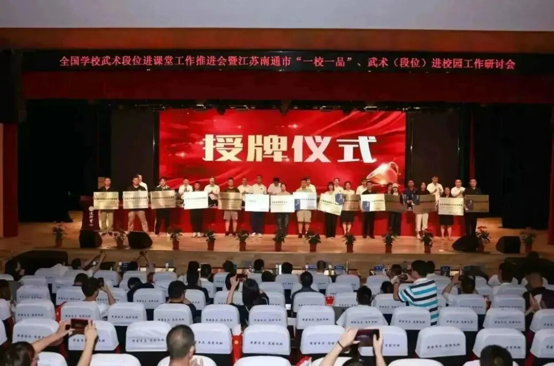 大会授予南通市教育局、南通市体育局、南通开发区社会事业局等3家单位全国学校段位武术进课堂突出贡献奖,授予复旦大学、浙江仙居中学、南通师范高等专科学校实验小学等51所大中小学为全国学校段位武术进课堂段位教学试验点学校。其中开发区的三家单位,我们实小集团的星湖校区、龙腾校区以及竹行小学获得试点学校授牌。