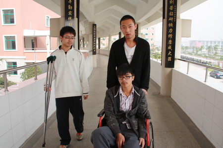 本周,在天星湖中学的校园里,你经常会发现这样的情景:一位同学拿着一副拐杖,另一位同学推着一辆双轮车,还有一位同学坐在车上。 经过打听得知,上周一次打篮球时,高二3班的朱益波同学不小心摔了一跤,结果导致膝盖骨受伤,一时不能行走,需要几天时间的保守治疗。于是本班的曹克凡、陈烽义务担负起了朱益波同学的护理工作。平时在路上推行还可以,而要抬着上楼则很费力气,但曹克凡、陈烽两位同学几天来依然毫无怨言地帮助朱益波同学。 这种急人之困、助人为乐的精神是天星湖中学人文校园中一个闪闪发光的亮点。